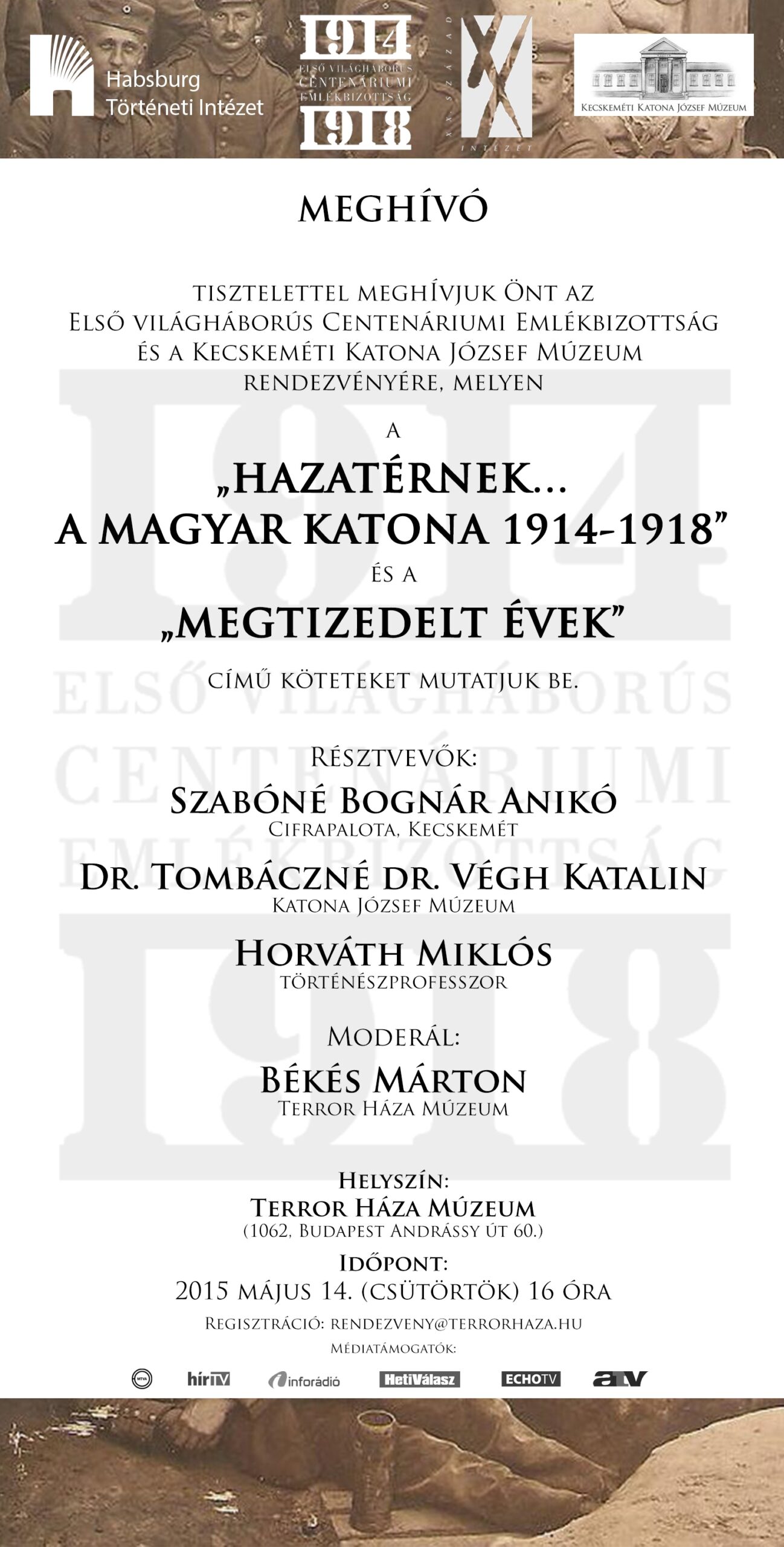 Tisztelettel meghívjuk Önt a „Hazatérnek. A magyar katona 1914-1918” és a „Megtizedelt évek”című kötetek bemutatójára, melyet a Kecskeméti Katona József Múzeummal közös szervezésben2015. május 14. (csütörtök) 16 órakor tartunk a Terror Háza Múzeumban (1062 Budapest, Andrássy út 60.).