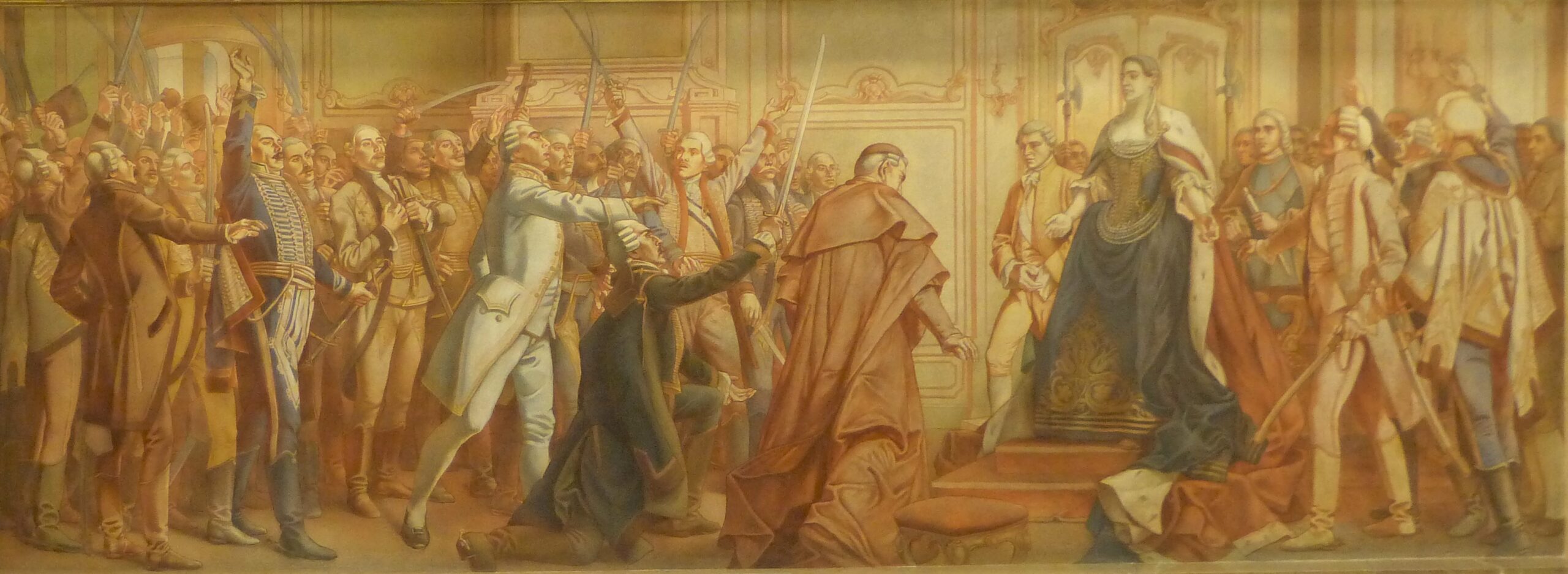 Jantyik Mátyás: Mária Terézia a pozsonyi országgyűlésen. Mária Terézia 1741. szeptember 11-én fekete gyászruhában jelent meg a pozsonyi országgyűlésen. A magyar rendek felajánlották segítségüket trónjának megvédéséhez. („Vita et sanguinem!”)